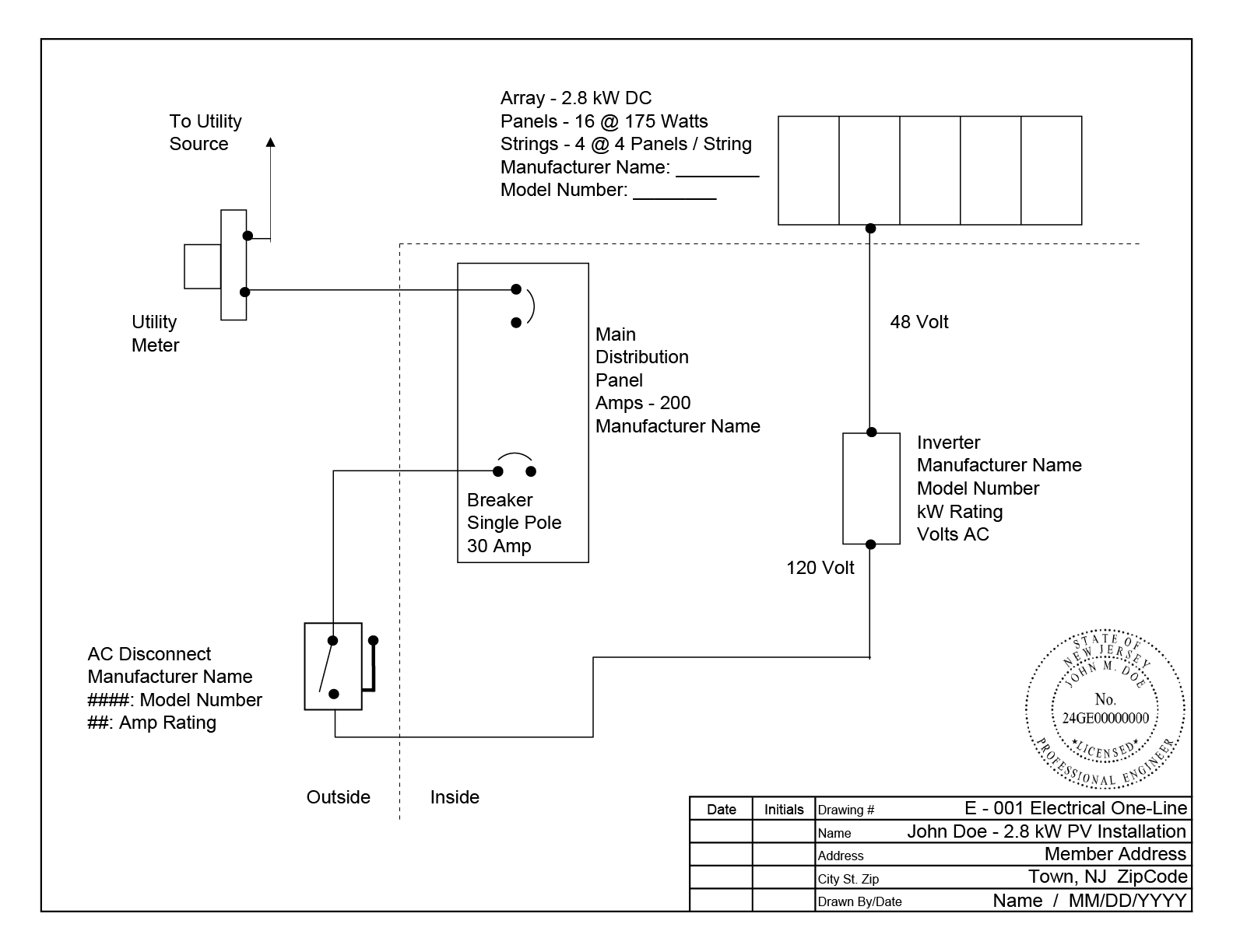 - One-Line Drawing - Technical diagram showing the system and its interconnection design with applicable Professional Engineer stamp. Click here for an example of the required one-line drawing.