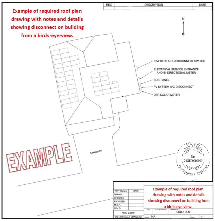 - Site Plan - Site plan should provide an aerial view of the structures, each panel in the system, and the orientation of the structure and panels with applicable Professional Engineer stamp. This site plan MUST include a clearly-marked manual AC disconnect visible from the meter location. Click here for an example of the required site plan.