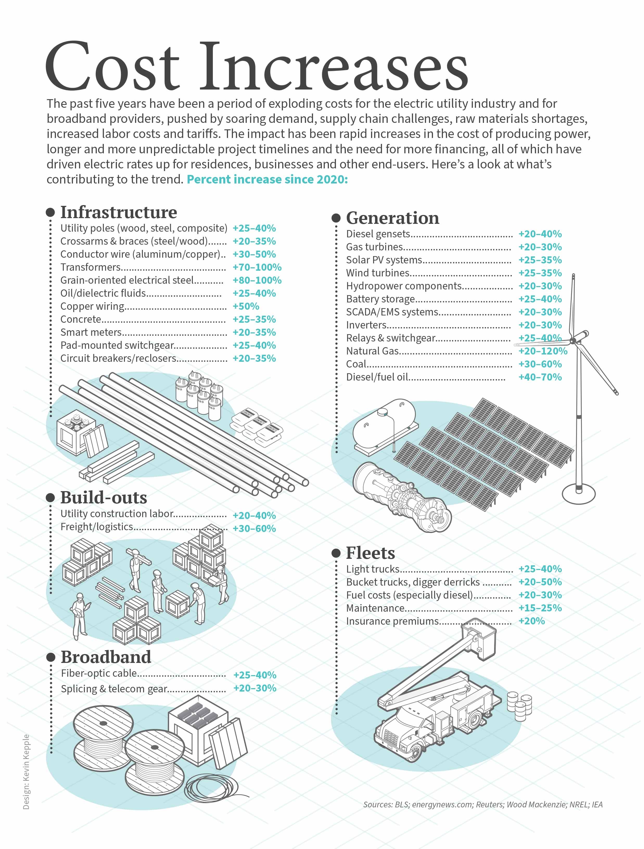 Cost Increases. (Graphic originally from RE Magazine, a publication of the National Rural Electric Cooperative Association). The past five years have been a period of exploding costs for the electric utility industry and for broadband providers, pushed by soaring demand, supply chain challenges, raw materials shortages, increased labor costs and tariffs. The impact has been rapid increases in the cost of producing power, longer and more unpredictable project timelines and the need for more financing, all of which have driven electric rates up for residences, businesses and other end-users. Here's a look at what's contributing to the trend. Precent increase since 2020: INFRASTRUCTURE. Utility poles (wood, steel, composite) +25-40%. Crossarms & braces (steel/wood) +20-35%. Conductor wire (aluminum/copper) +30-50%. Transformers +70-100%. Grain-oriented electrical steel +80-100%. Oil/dielectric fluids +25-40%. Copper wiring _50%. Concrete +25-35%. Smart meters +20-35%. Pad-mounted switchgear +25-40%. Circuit breakers/reclosers +20-35%. BUILD-OUTS. Utility construction labor +20-40%. Freights/logistics +30-60%. BROADBAND. Fiber-optic cable +25-40%. Splicing & telecom gear +20-30%. GENERATION. Diesel gensets +20-40%. Gas turbines +20-30%. Solar PV systems +25-25%. Wind turbines +25-35%. Hydropower components +20-30%. Battery storage +25-40%. SCADA/EMS systems +20-30%. Inverters +20-30%. Relays & switchgear +25-40%. Natural Gas +20-120%. Coal +3--60%. Diesel/fuel oil +40-70%. FLEETS. Light trucks +25-40%. Bucket trucks, digger derricks +20-50%. Fuel costs (especially diesel) +20-30%. Maintenance +15-25%. Insurance premiums +2-%. Design: Kevin Kepple. Sources: BLS; energynews.com; Reuters; Wood Mackenzie; NREL;IEA